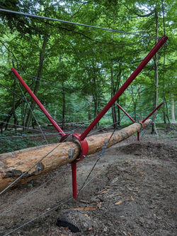 In terms of craftsmanship, the design relies on material contrast. The structural base is formed by rough-hewn tree trunks, while modern fasteners, steel cables, and technical components provide reinforcement and load distribution.